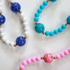 Featuring round acrylic beads, gold plated spacers & chunky paisley bandana printed beads in choice of colours.