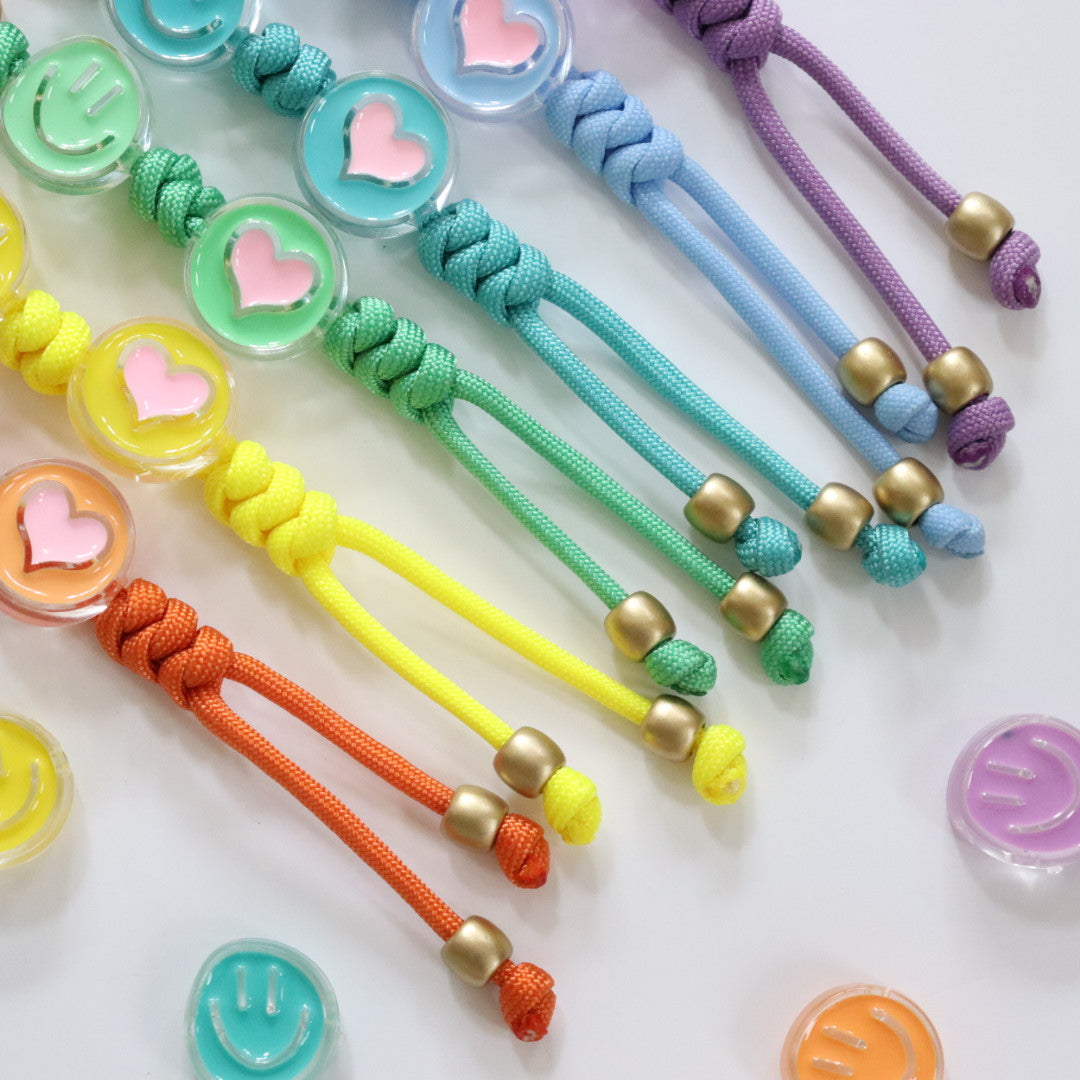 Featuring transparent oil drop smiling face & heart beads, strung on to colourful premium paracord with a gold keychain clasp. Also includes an additional spring ring to attach your keys &/or other decorative items.