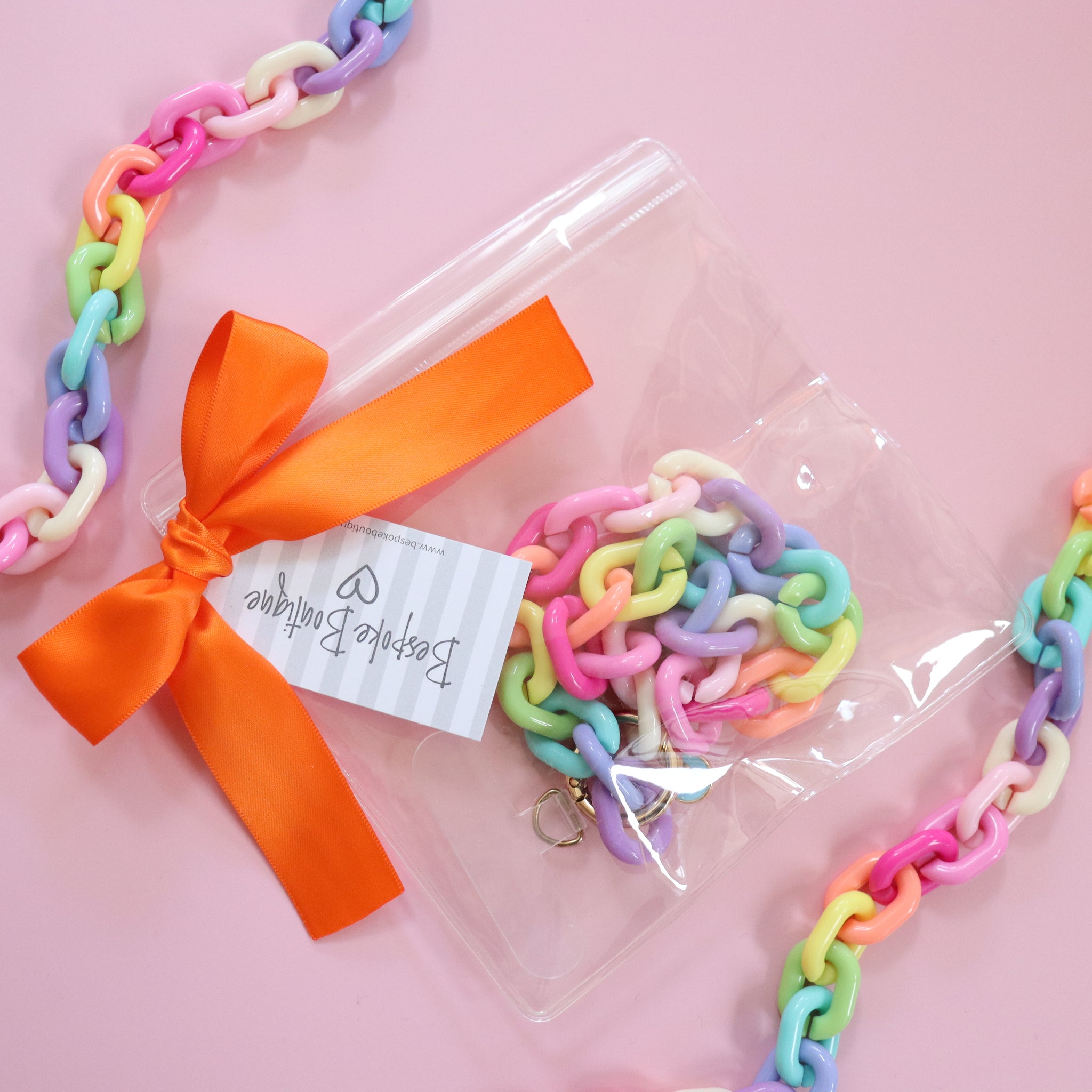 Featuring acrylic chain links assembled in a rainbow format on a gold spring ring. Personalisation is optional - so add an enamel initial charm for no extra charge if you wish (random rainbow colour).