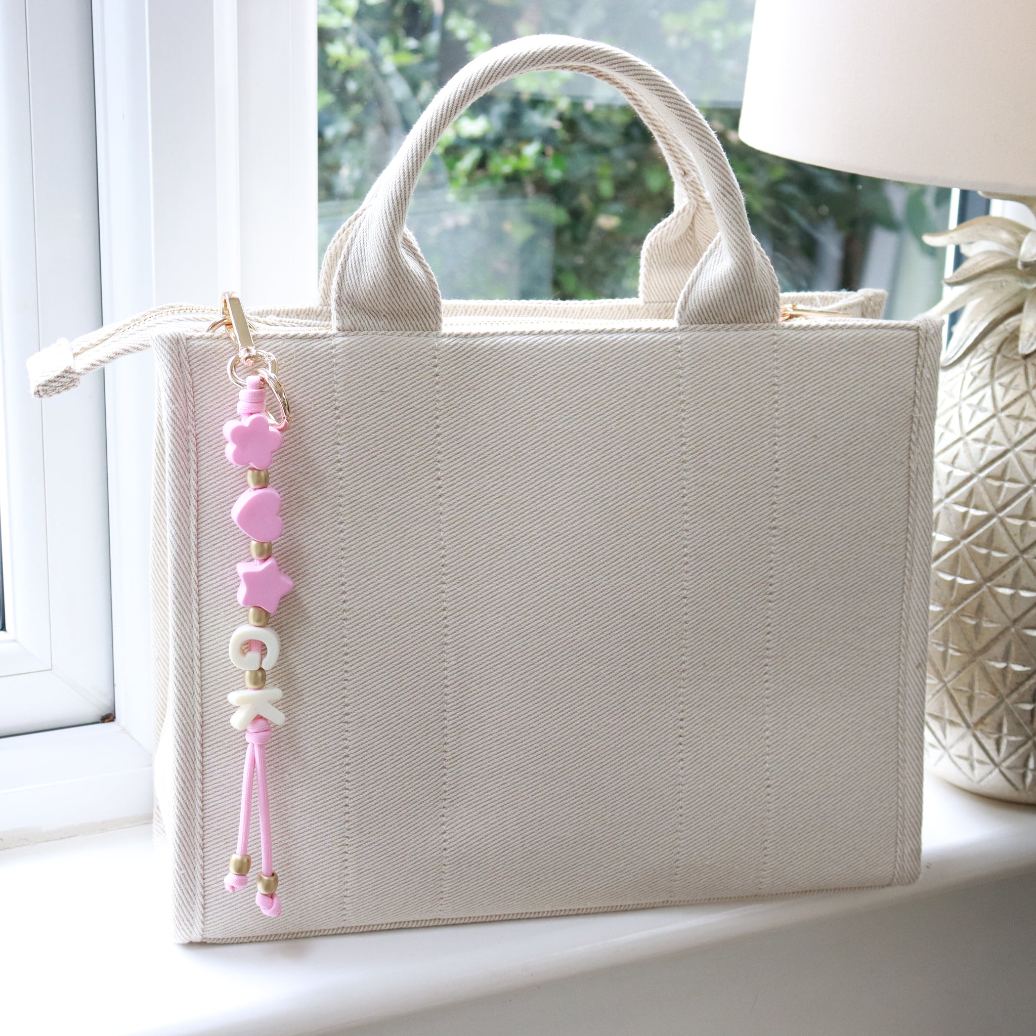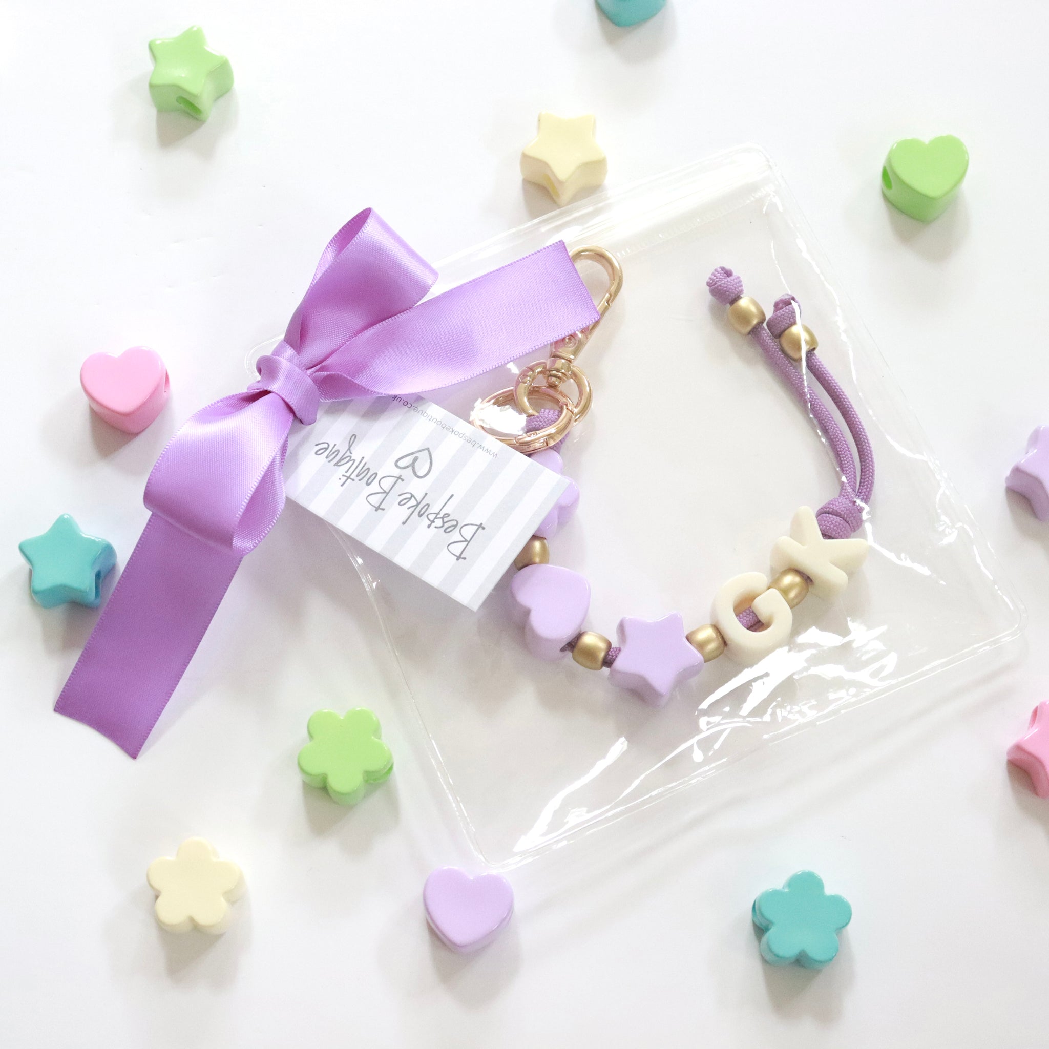 Featuring a chunky flower, heart & star bead, gold spacers & 2 letters of your choice, strung onto colourful premium paracord with a gold keychain clasp. Also includes an additional spring ring to attach your keys &/or other decorative items.