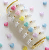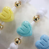 Featuring white round acrylic beads, chunky gold spacers & a pastel smiling heart strung over a row of Miyuki seed beads which creates a sliding fidget element.